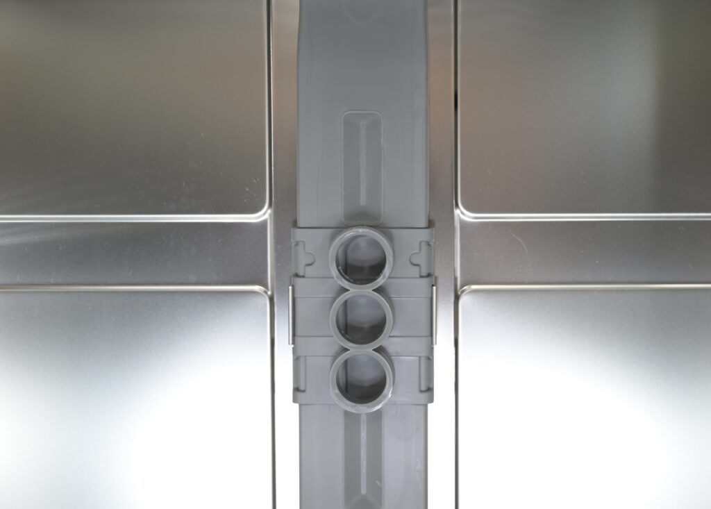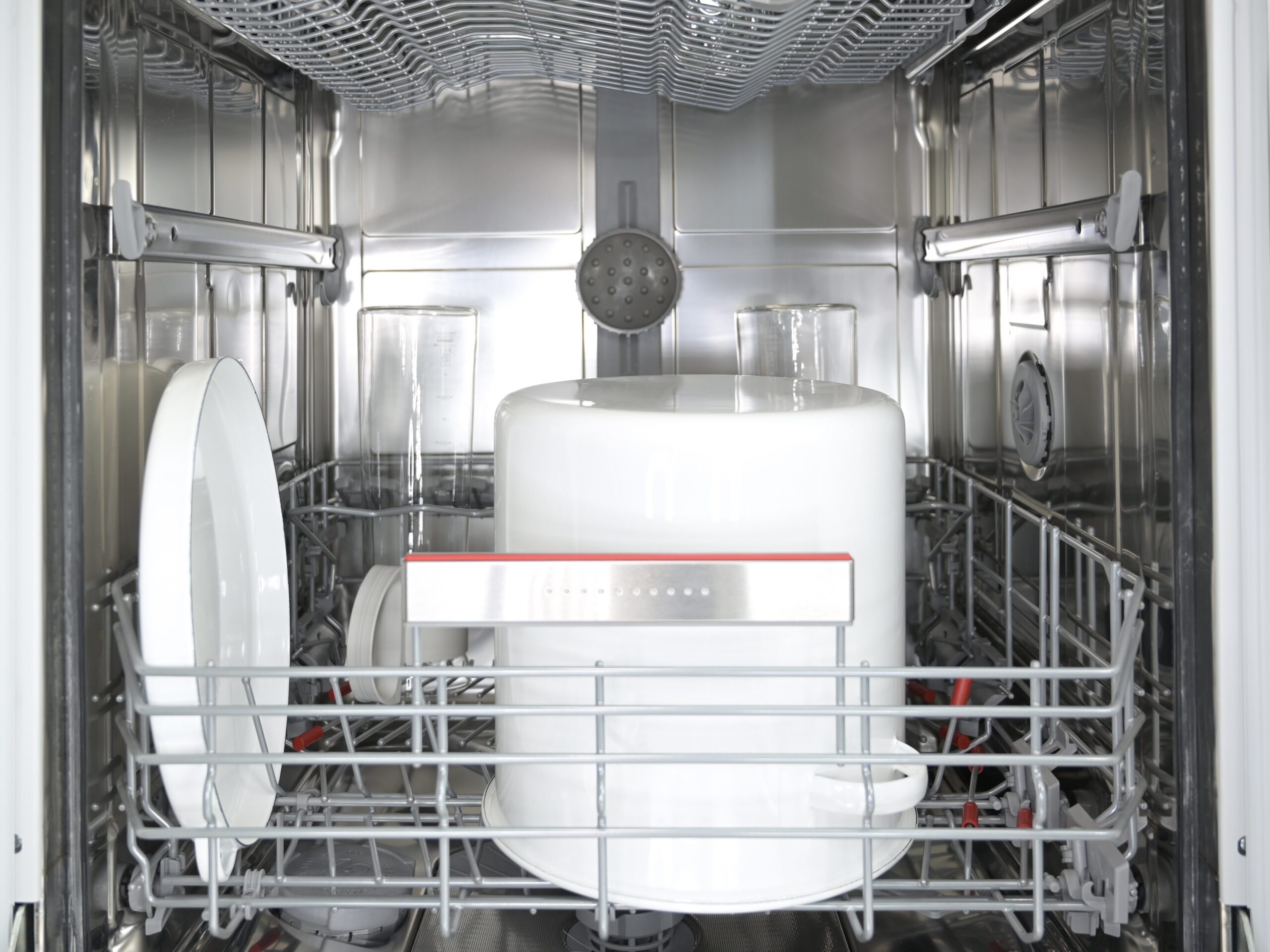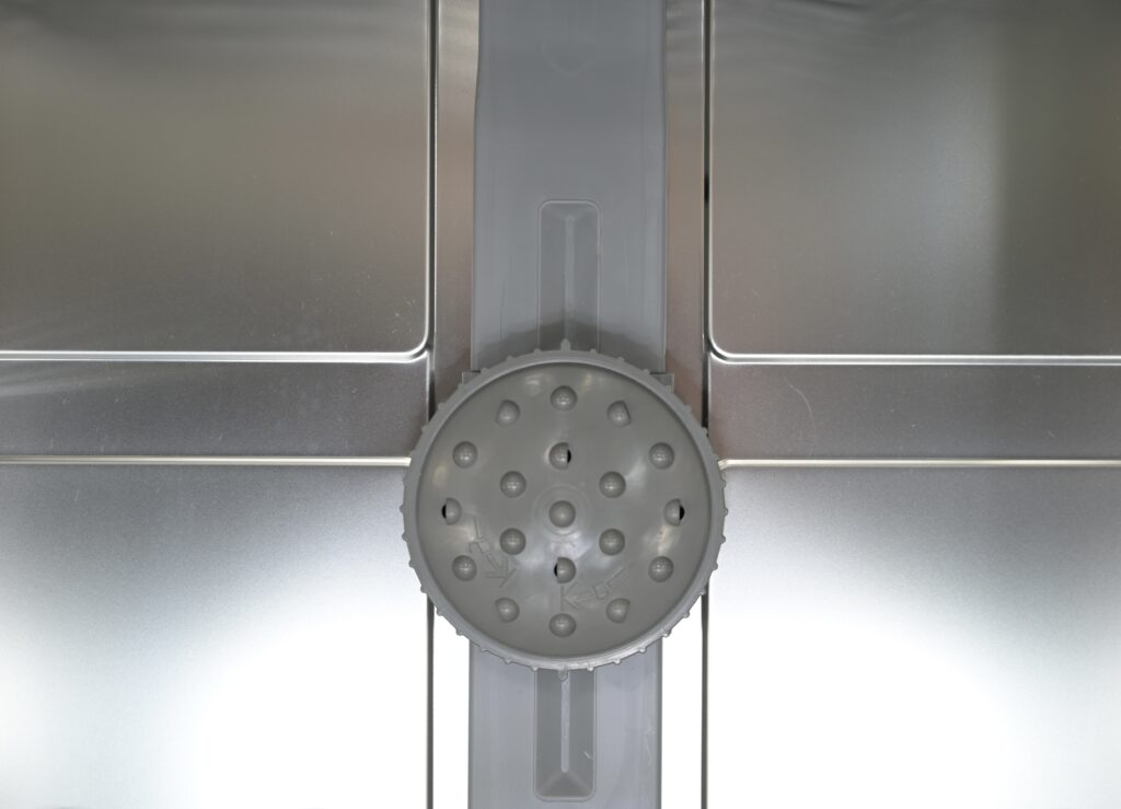 下段バスケットの下にあるスプレーアームと、ベイキングトレイスプレーヘッドの左右からもスプレーが噴射しますので、壁面に立てた調理器具に直接水圧が当たり、下と横の2方向から水が噴き出すので洗浄効果がアップします。