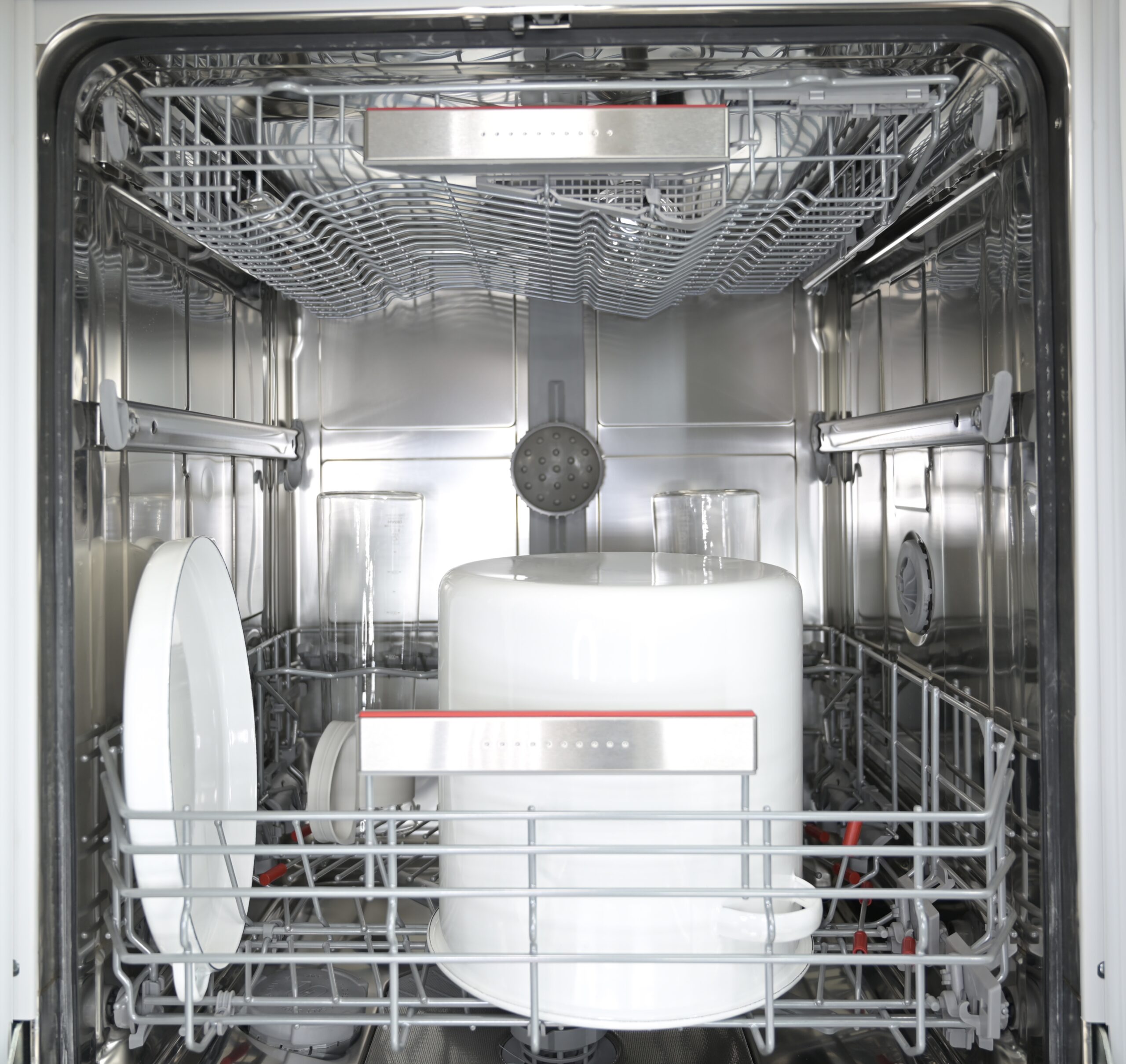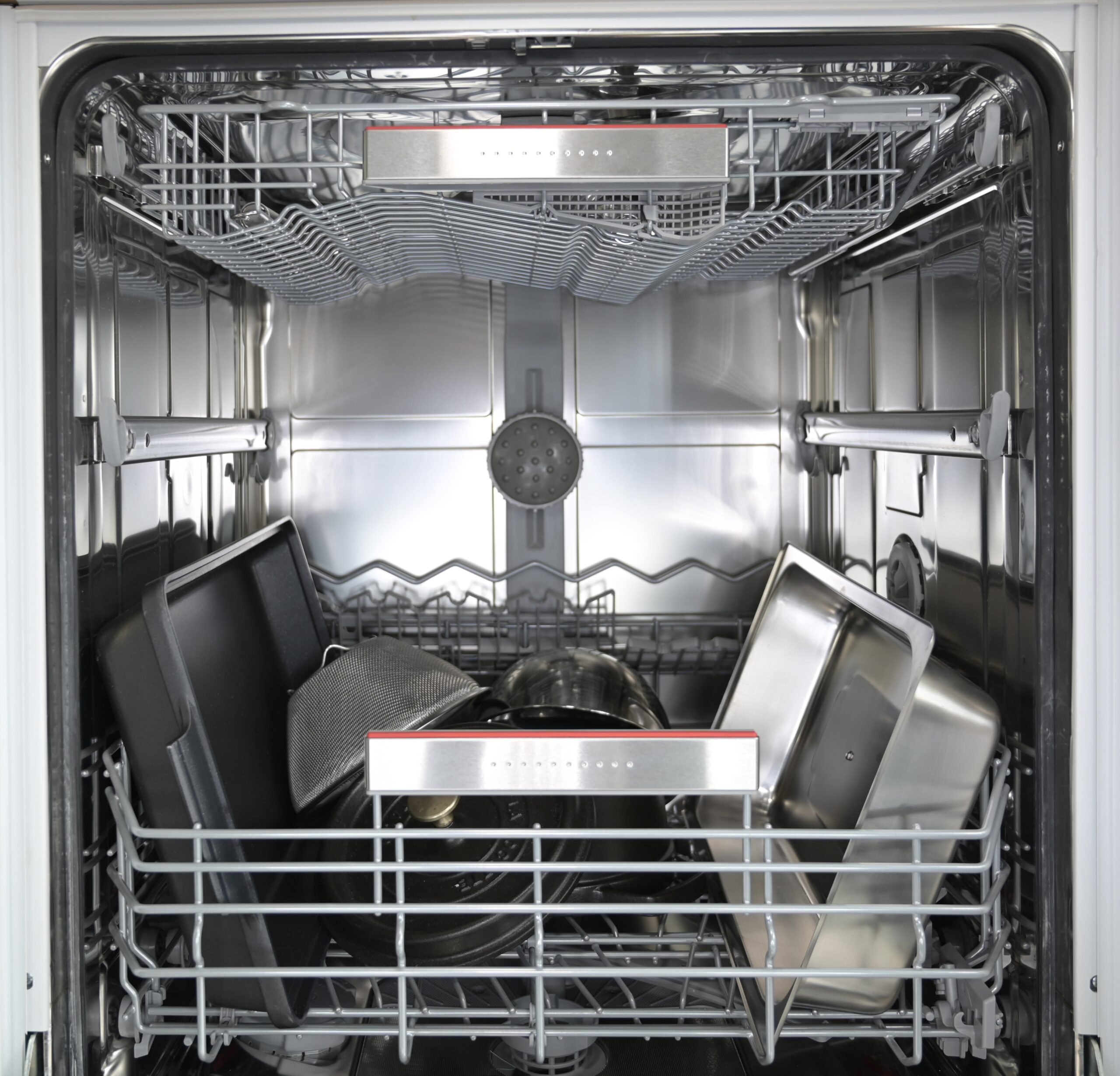 下段バスケットの下にあるスプレーアームと、ベイキングトレイスプレーヘッドの左右からもスプレーが噴射しますので、壁面に立てた調理器具に直接水圧が当たり、下と横の2方向から水が噴き出すので洗浄効果がアップします。