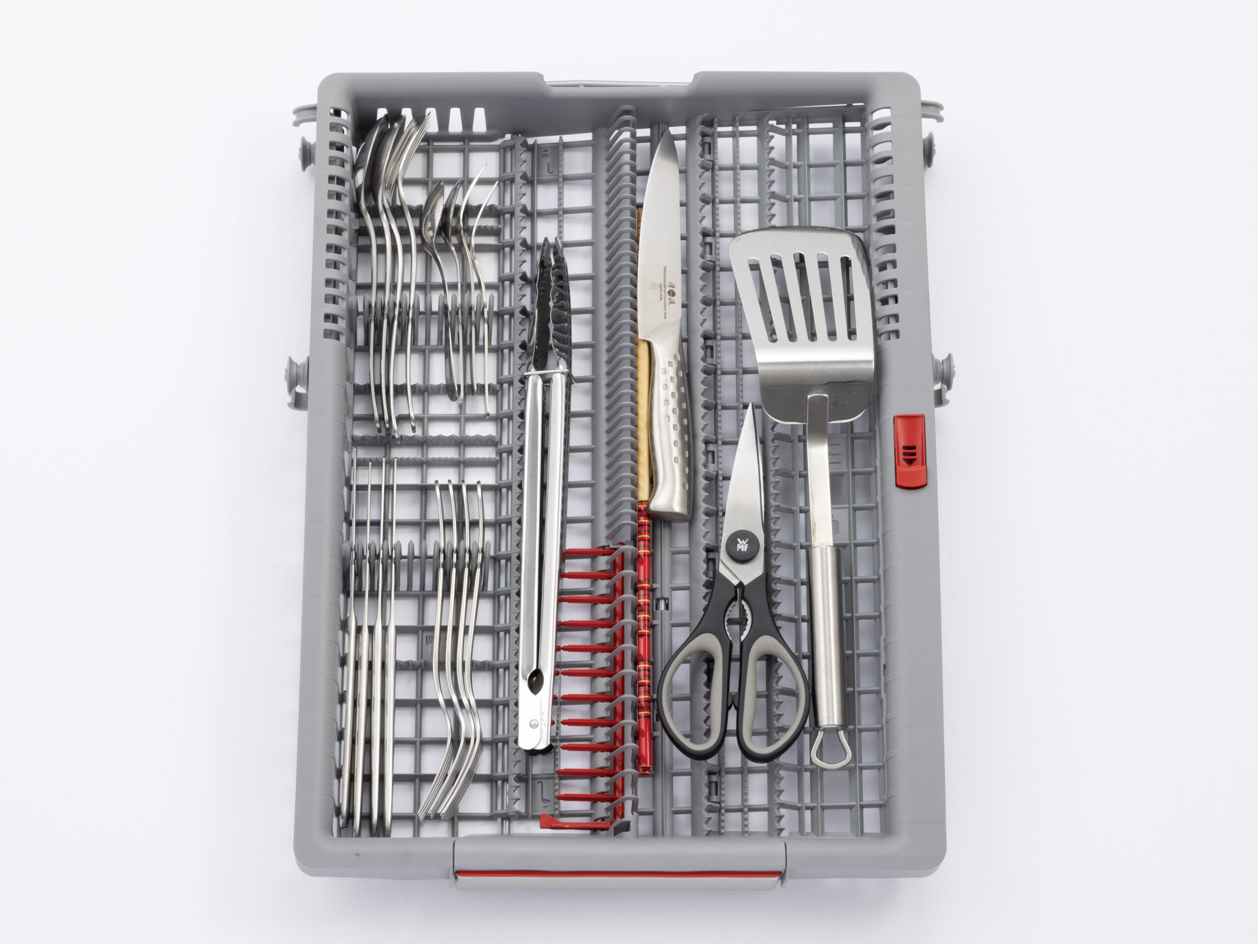 スプーンやフォークの柄の部分が太い場合は、中央にあるトレイ手前の赤いピンを倒すことでピンの間隔を広げてご使用いただけます。