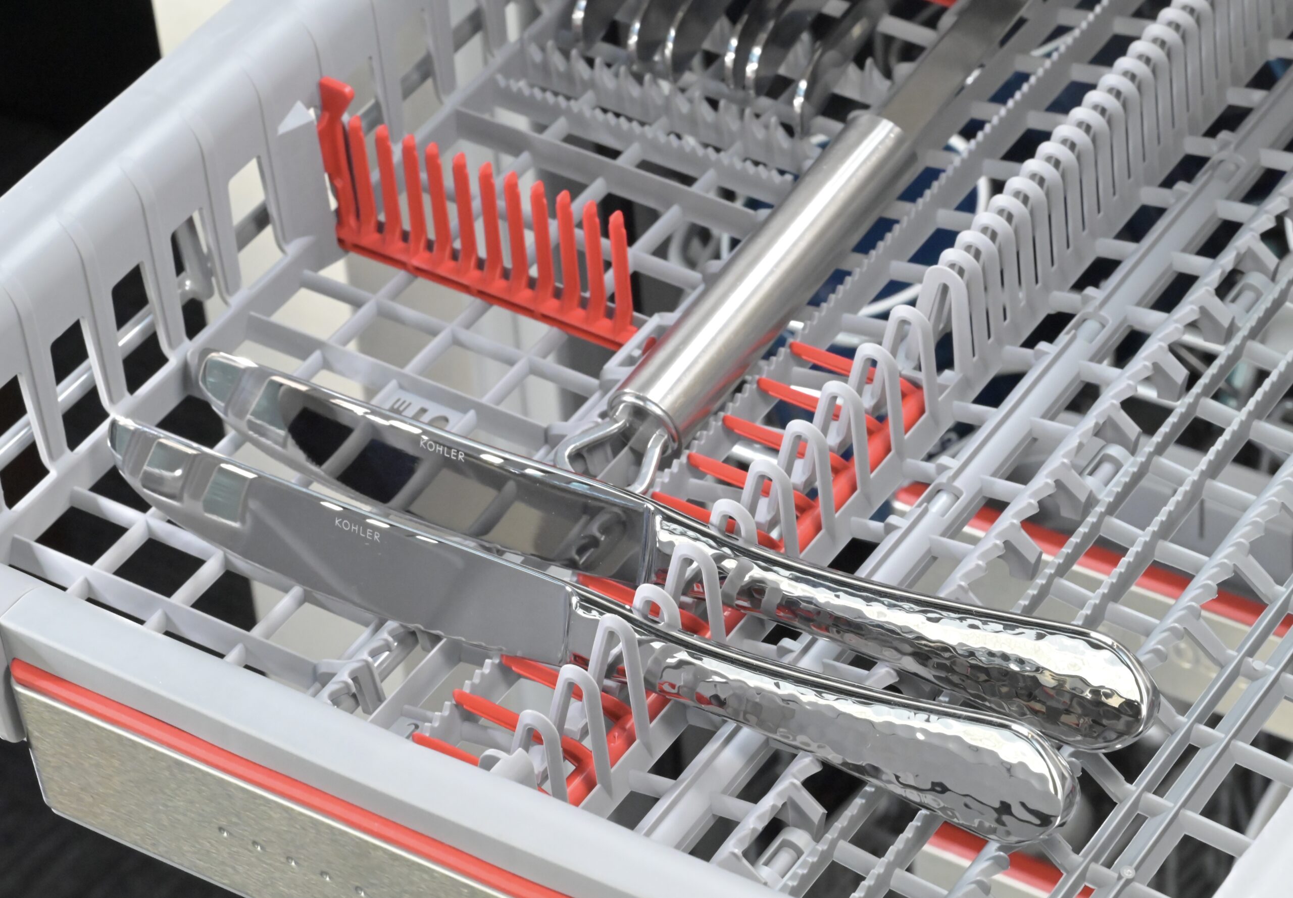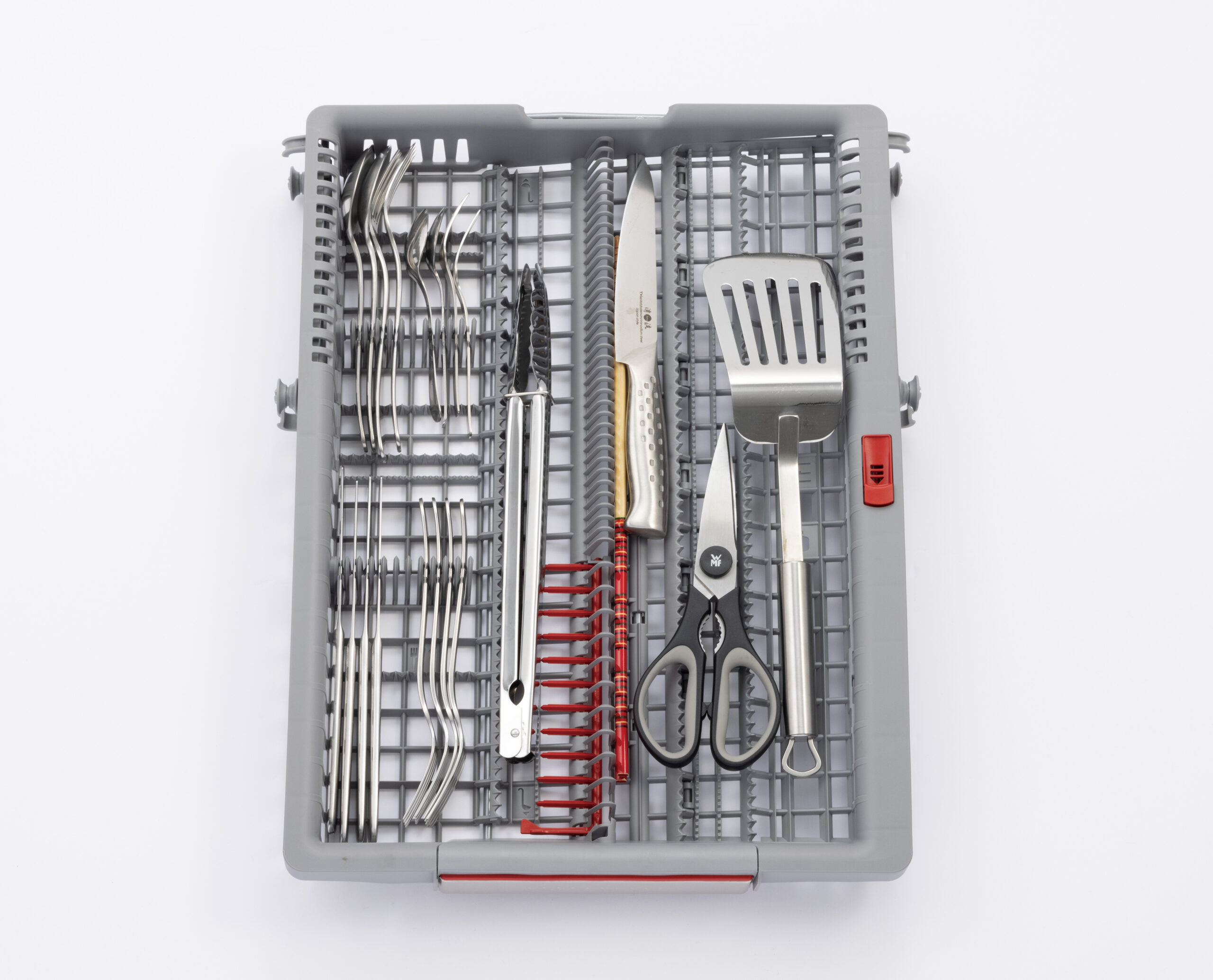 スプーンやフォークの柄の部分が太い場合は、中央にあるトレイ手前の赤いピンを倒すことでピンの間隔を広げてご使用いただけます。