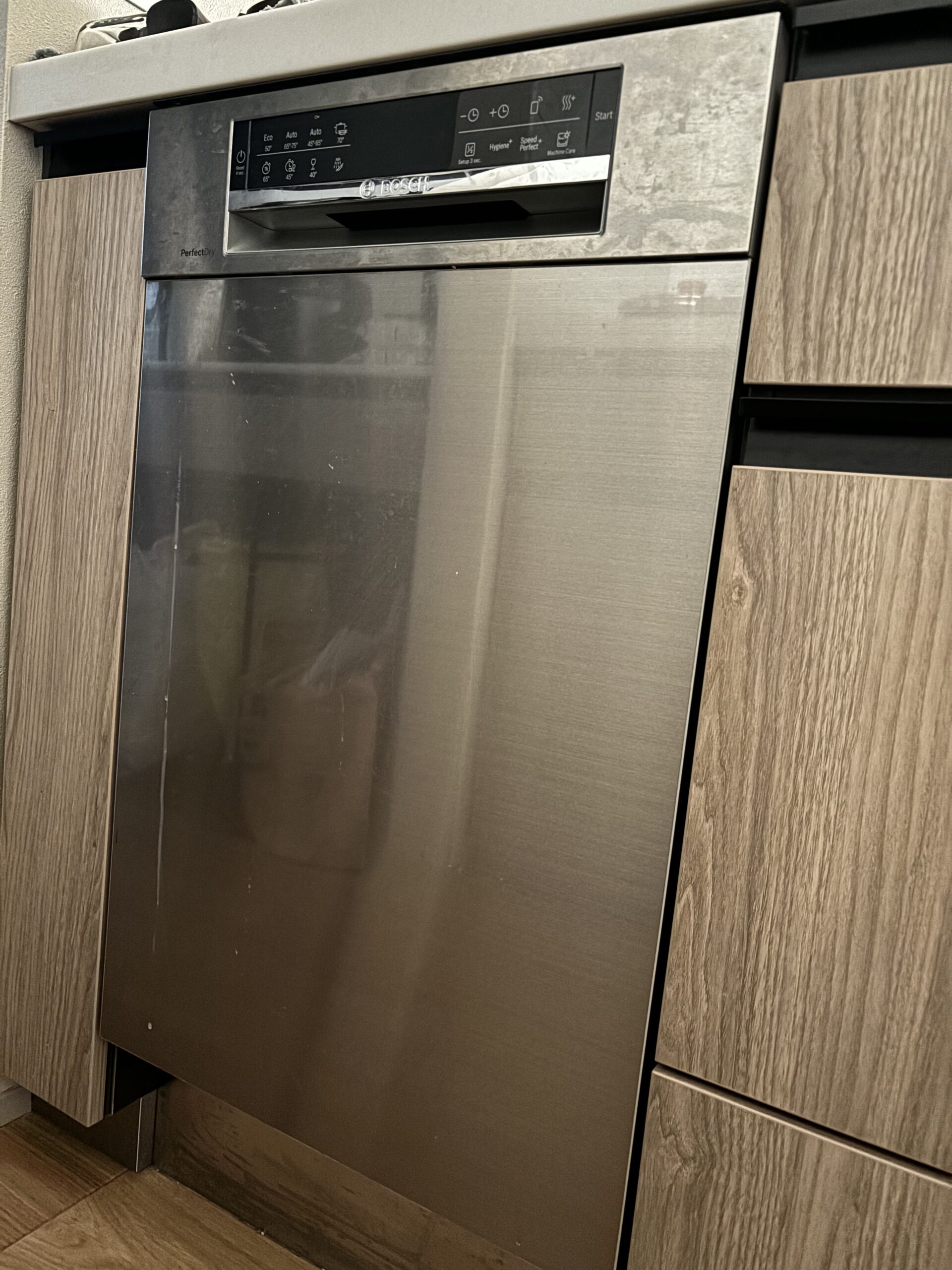 予洗い不要でフルオープンのドア、大容量というところが気に入って、元から食洗機はBoschと決めていた。